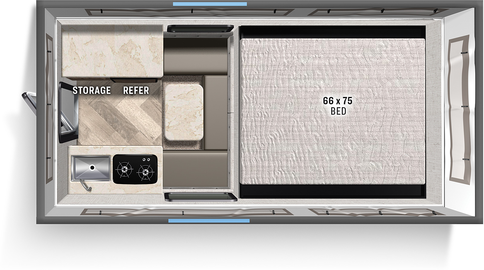 Standard equipment aboard the BunduTec USA Topi begins with a 1.9-cubic-foot 12V refrigerator, a single stainless-steel sink, a pull-out kitchen faucet, a pressurized water system, and a two-burner drop-in stove in the galley area. Comfort and convenience standards include an electric roof vent, a 12,000 BTU furnace heater, privacy window shades, a tinted entrance door with a screen, lots of interior storage compartments, and locking exterior compartments.