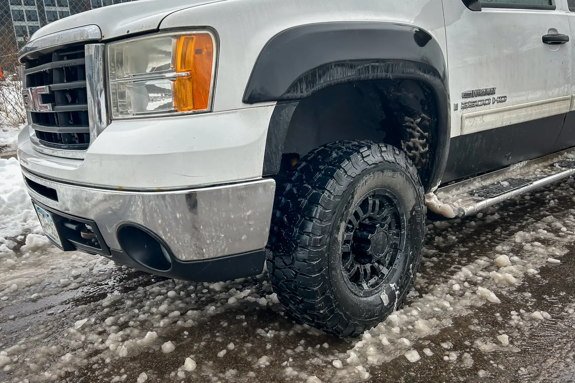 I drive a 2007 GMC Sierra 2500 HD to the job site. It’s not lifted and it’s definitely a workhorse. With these LT265/75/R16 tires (the same size as my previous all-terrains) I now experience tire rub in the wheel well when the wheel is fully turned to either side.