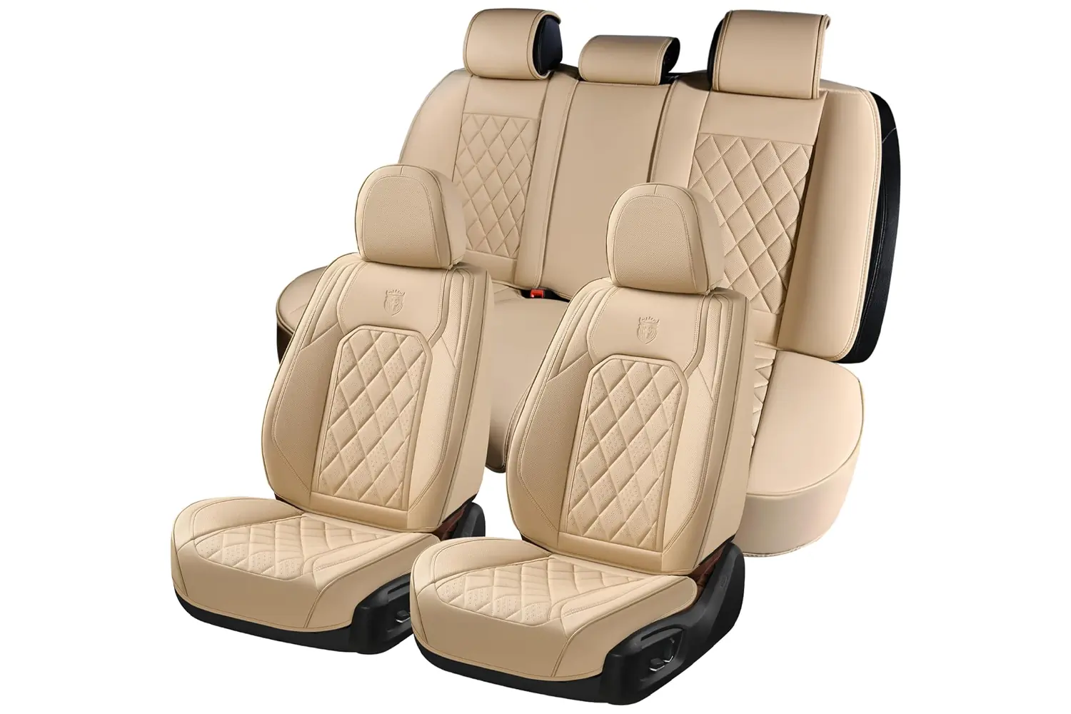 In a collection that includes car seat covers for the front and back of the vehicle, as well as the headrests, this is a full matching upgrade that protects the vehicle’s entire upholstery. Overall, this design’s faux leather holds up to abrasion and sun exposure, easily wipes clean, and looks sharp day after day.