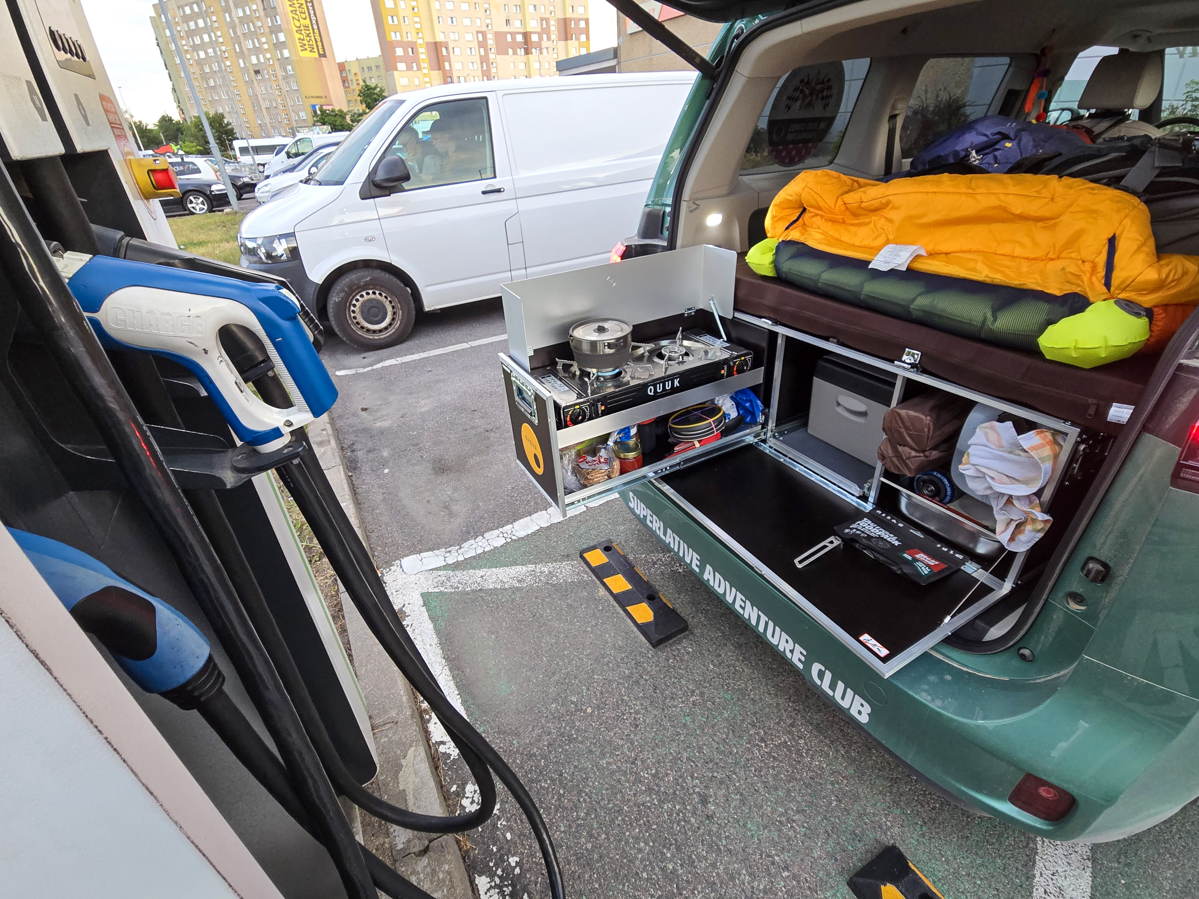 Our hectic pace didn’t allow Instagram-worthy meals cooked out of the back of a van in a picturesque Euro locales. Much of our cooking and eating was actually done while charging in parking lots — far from scenic — but quite efficient. We’d plug in, open the back, and eat fresh salmon, cheese, and bread for breakfast or lunch.