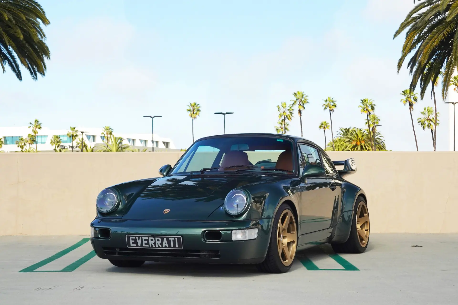 On paper, the so-called Evergreen Commission car looks more restrained in some ways. Oak Green Metallic paint over Harvest Tan upholstery certainly plays up the quintessential Porsche style. Then again, the 964-generation RSR-inspired widebody and massive carbon-fiber wing hint at the performance potential beneath such svelte skin.
