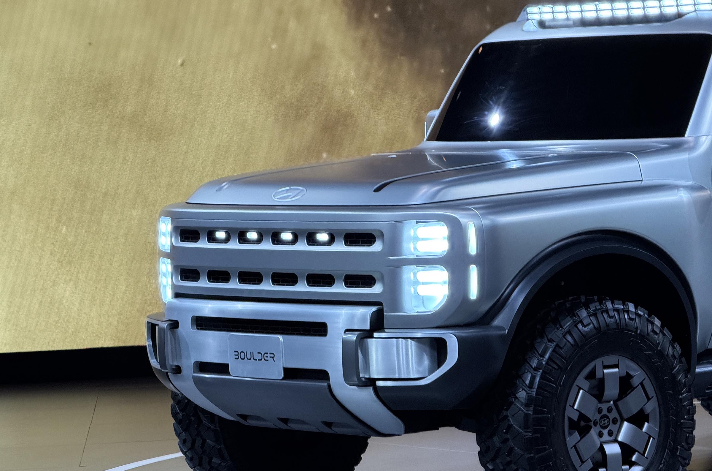 Though a bit less over the top than last year’s Crater Concept, Boulder has the look and the dimensions of a true off-roader, with a bold, upright grille, short overhangs, and 37-inch all-terrain tires. Though Hyundai declined to provide hard numbers, Boulder appeared to be roughly the width and length of a Ford Bronco Raptor.