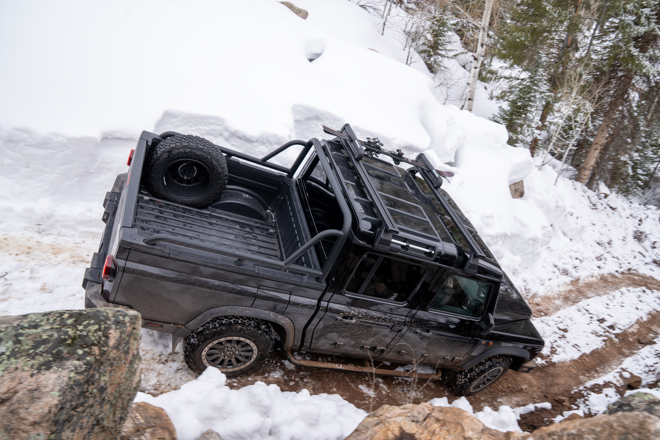 I was genuinely impressed — not just with how planted and stable the truck felt on snow-covered roads and icy streets, but with how confidently it handled technical terrain in deep snow. Ineos had built a short test course throughout Kevin Costner’s Dunbar Ranch, and while they had to be mindful of what they were doing on a $100-million property, the storm made it just challenging enough to warrant engaging the lockers.