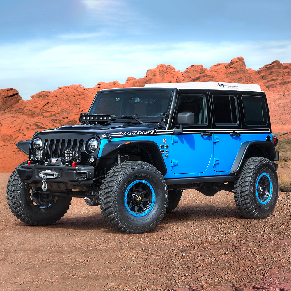 Light up the trail with an arsenal of lighting features on the Jeep Luminator concept. Underbody rock lights, 7-inch LED projector bi-function headlamps, LED tail lamps, high-powered LED spot lights, upper bumper LED lighting, and cornering fog lamps controlled by the steering angle are some of the lighting accessories. An active spot light with dynamic following technology shines the trail ahead to avoid wildlife or trail hazards. On top of everything, a high-mounted stop light with four different colors let’s riders behind you know your speed with stop (red), 1-3 mph (amber), and 3-25 (green) modes.
