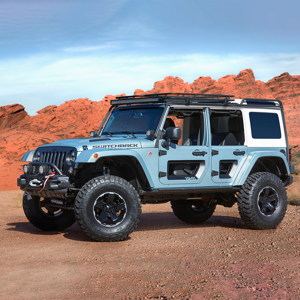 Tackle whatever obstacles the trail may have with the Jeep Switchback concept. Equipped with a 4-inch lift, Remote Reservoir Fox shocks, steel front and rear bumpers, a Rubicon winch and winch guard, cold air intake, 37-inch tires, and a 3.6-liter Pentastar V-6, this jeep surely can handle some serious terrain.