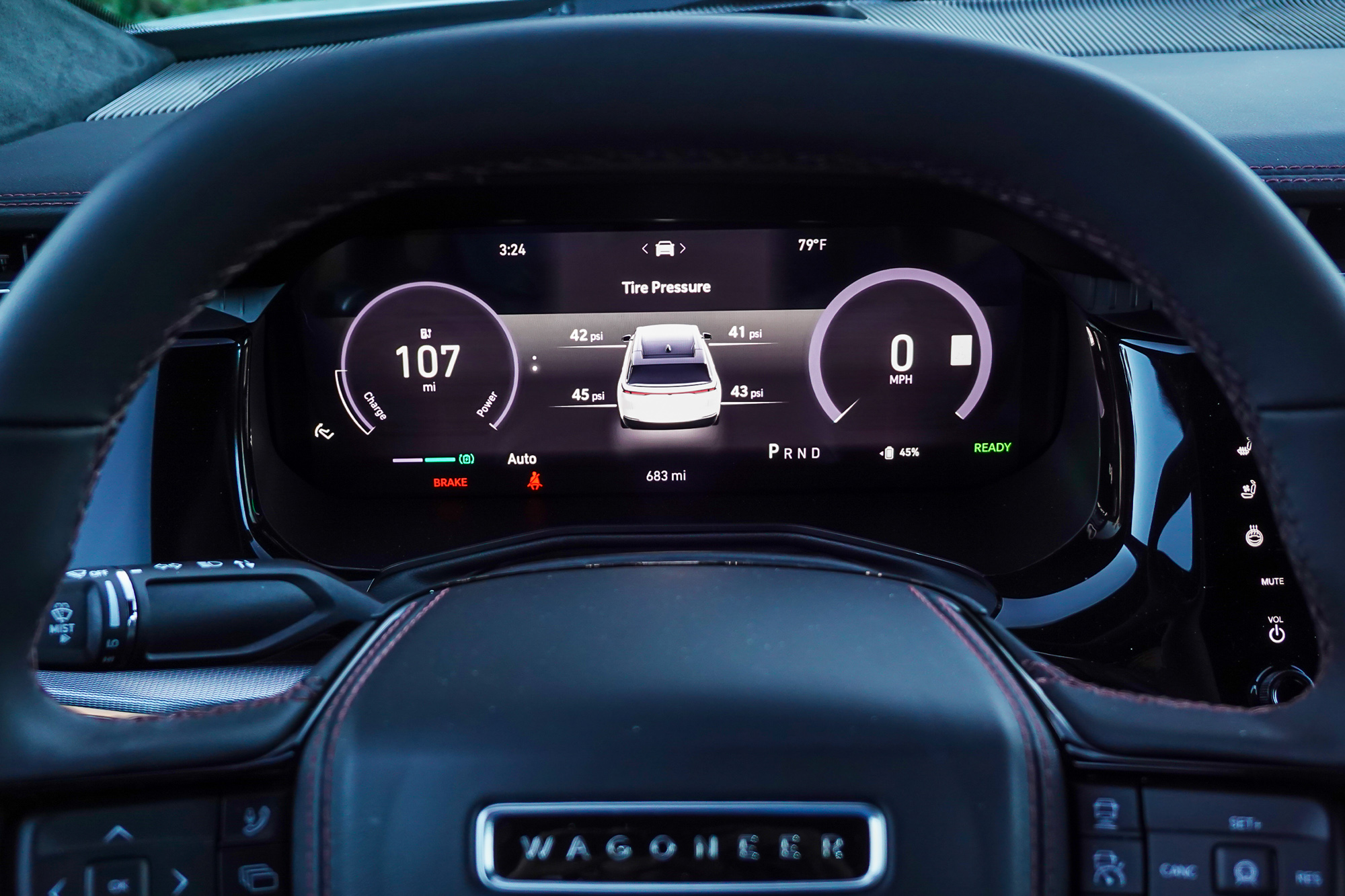 In fact, I’ve never said or written this about any car ever before: I actually preferred the Wagoneer S in Eco mode. Here, the more progressive throttle modulation and dampened steering reduced a slight twitchy nature that kept my foot and hands on edge in Auto or Sport mode. That’s when the light steering seemed to get slightly overwhelmed by torque steer, and the gas pedal’s sensitivity made holding a steady speed somewhat difficult.