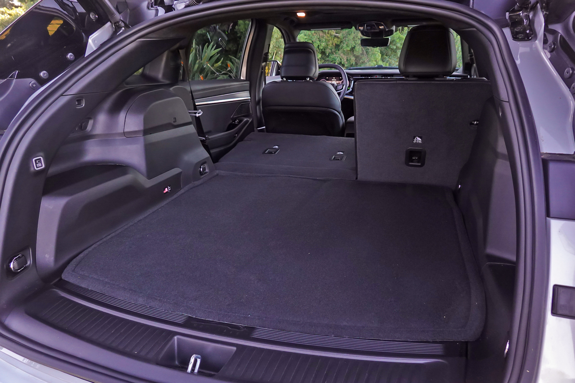 The trunk cargo area’s large footprint allows for packing in plenty of gear, too, even if the total cubic footage measurement drops a bit because of the low-sloping rear window. As a plus, a small frunk allows for a bit of secure storage under the hood.