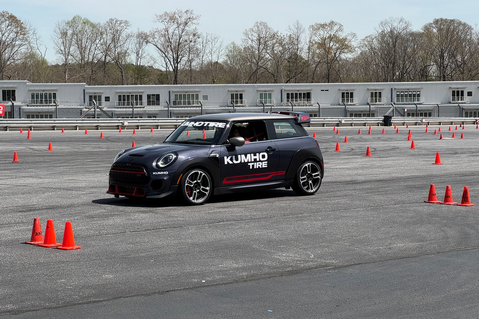 Things quickly got interesting when experiencing the ultra-high-performance summer tire versions of the Ecsta. Kumho bolted them up to a variety of Porsche Cayman and 911 sports cars plus a Mini Cooper GP3. The lone front-wheel-drive car of the bunch, the Mini lapped the autocross course in a tidy fashion.