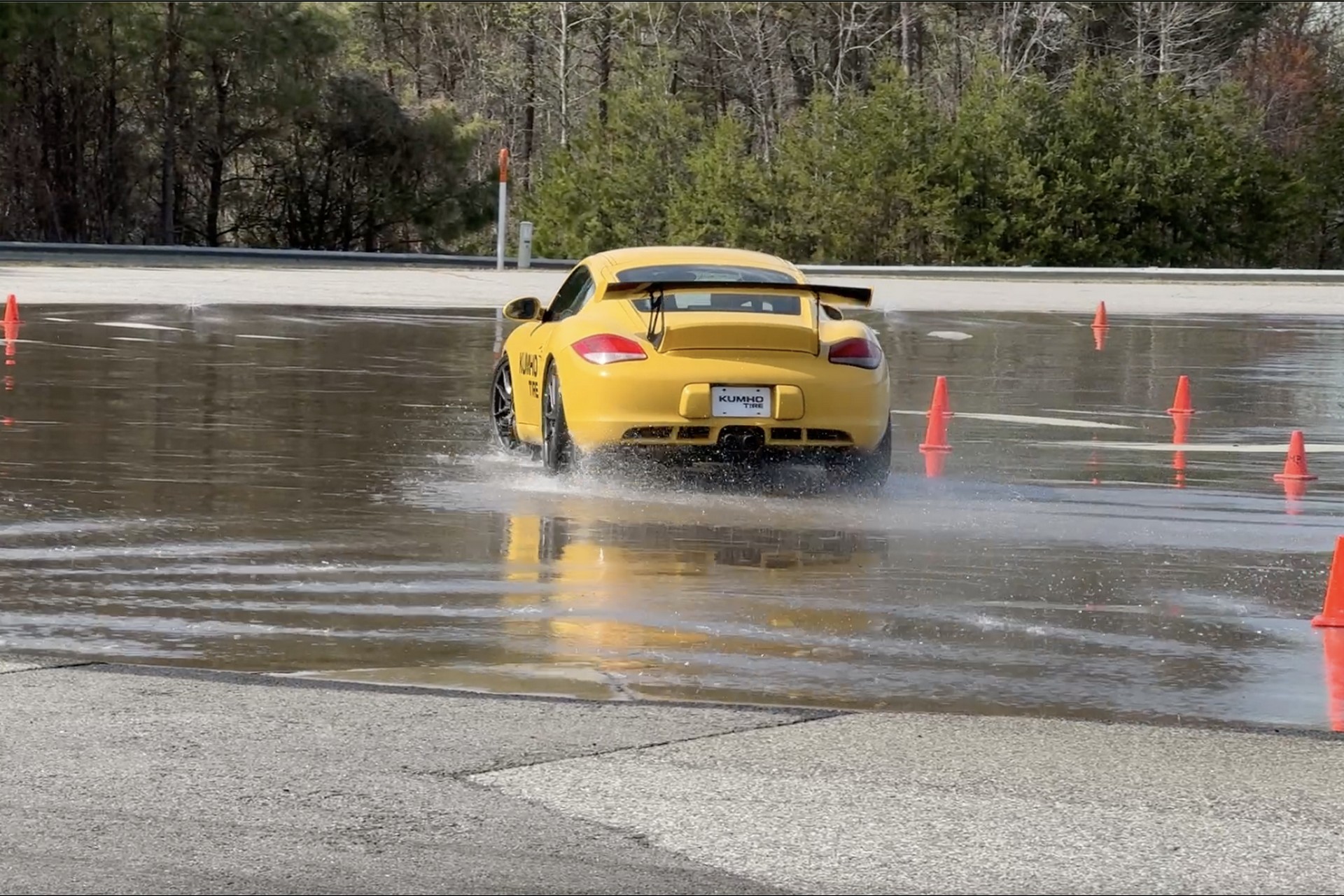 As the PDK of the Porsche Cayman GT4 RS downshifts, I nose into a mid-speed sweeping left at maximum lateral Gs. As I do, the rear end swings out. I countersteer and dab the throttle to keep things steady and dance through the corner with stress-free poise. But these sliding tires aren’t a set of track day Michelins. Rather, they’re the new Kumho Ecsta Sport S holding on to the track and keeping the Porsche on pavement.