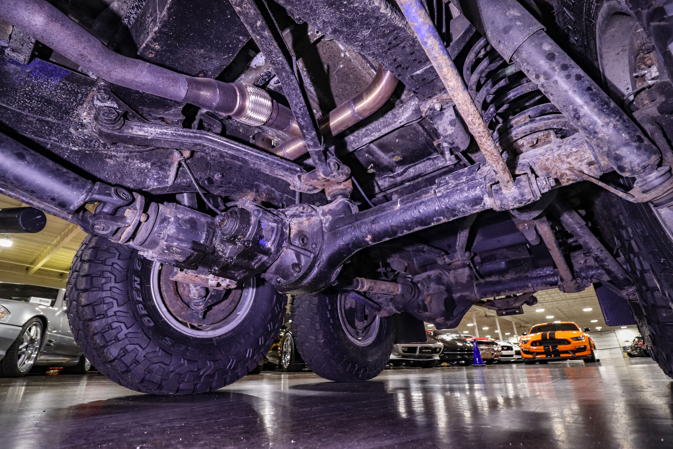 Photos of the underside show the oddball arrangement, where the center axle is driven from an offset driveshaft from the front. It looks strange, but it at least looks fairly simple. You can also see from those underside pics that there’s not much in the way of rust and that the piping to the in-bed exhaust stacks looks extremely fresh.