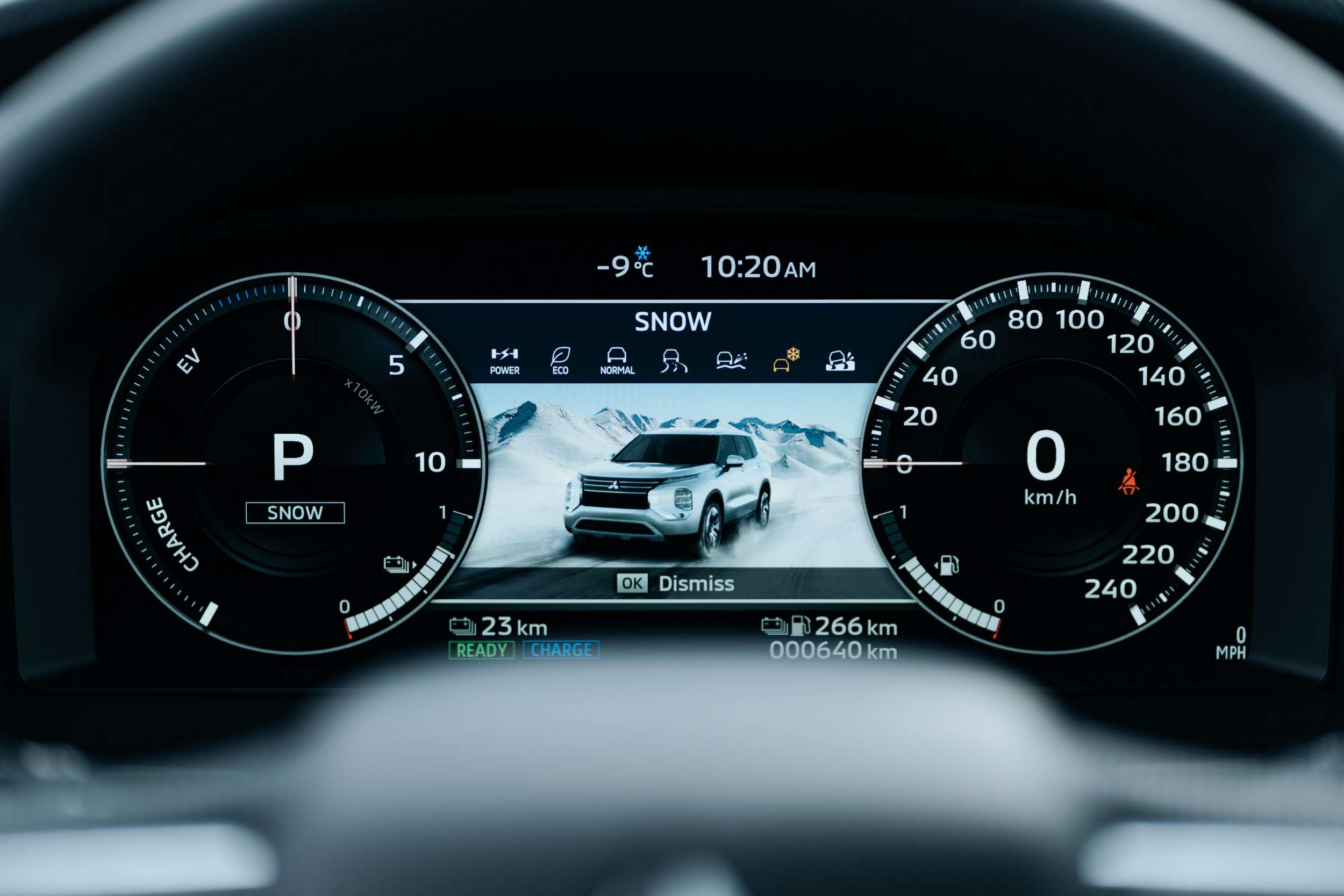 Intelligent Pedal, Mitsubishi’s one-pedal EV drive mode, made this even easier. It would apply the brakes automatically, helping to tuck the nose in and make sure the S-AWC system had something to work with. It will brake at up to 0.2G, enough to slow the vehicle without locking the tires.