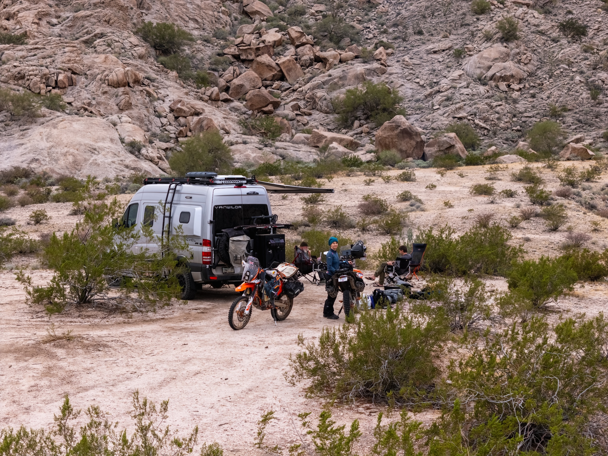I felt completely graveled. It was then, among the growing shadows, that we rallied. Hoisting my motorcycle into the sanctuary of the campervan alleviated the burden of the blue funk I was in.