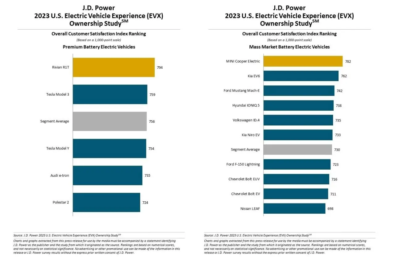 In its first year, the Rivian R1T pickup earned a satisfaction score of 794 out of 1,000. That outranked the Mini Cooper SE in second place with 782. (The compact EV did register the highest score in the Mass Market EV segment.)
