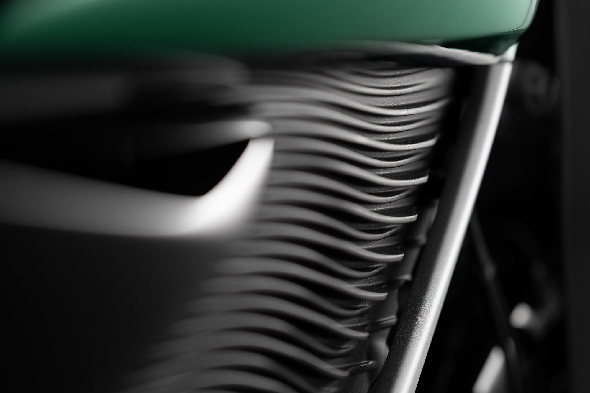 The brand hints at capabilities beyond urban commutes with a first-of-its-kind modern update to the original Flying Flea front suspension, with a forged aluminum Girder fork and articulating mudguard. This unique system mates with a forged aluminum frame that encases a finned magnesium battery case that saves weight and enhances cooling.