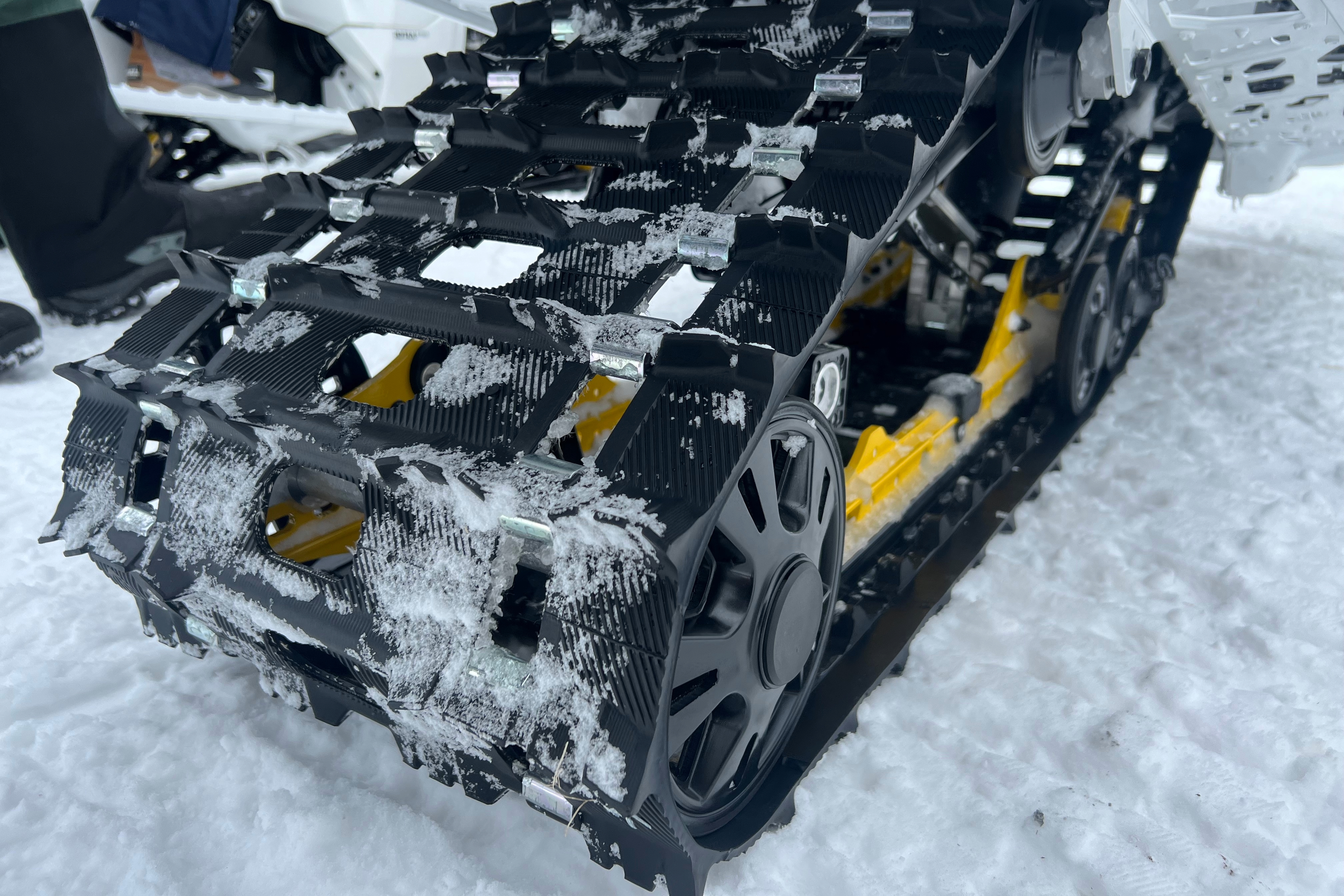 The track on these electric Grand Touring snowmobiles is specific to this model. It’s only 120 inches long and 14 inches wide. It has small, specially designed 0.75-inch lugs, and is vented to reduce the sled’s weight and add flexibility.