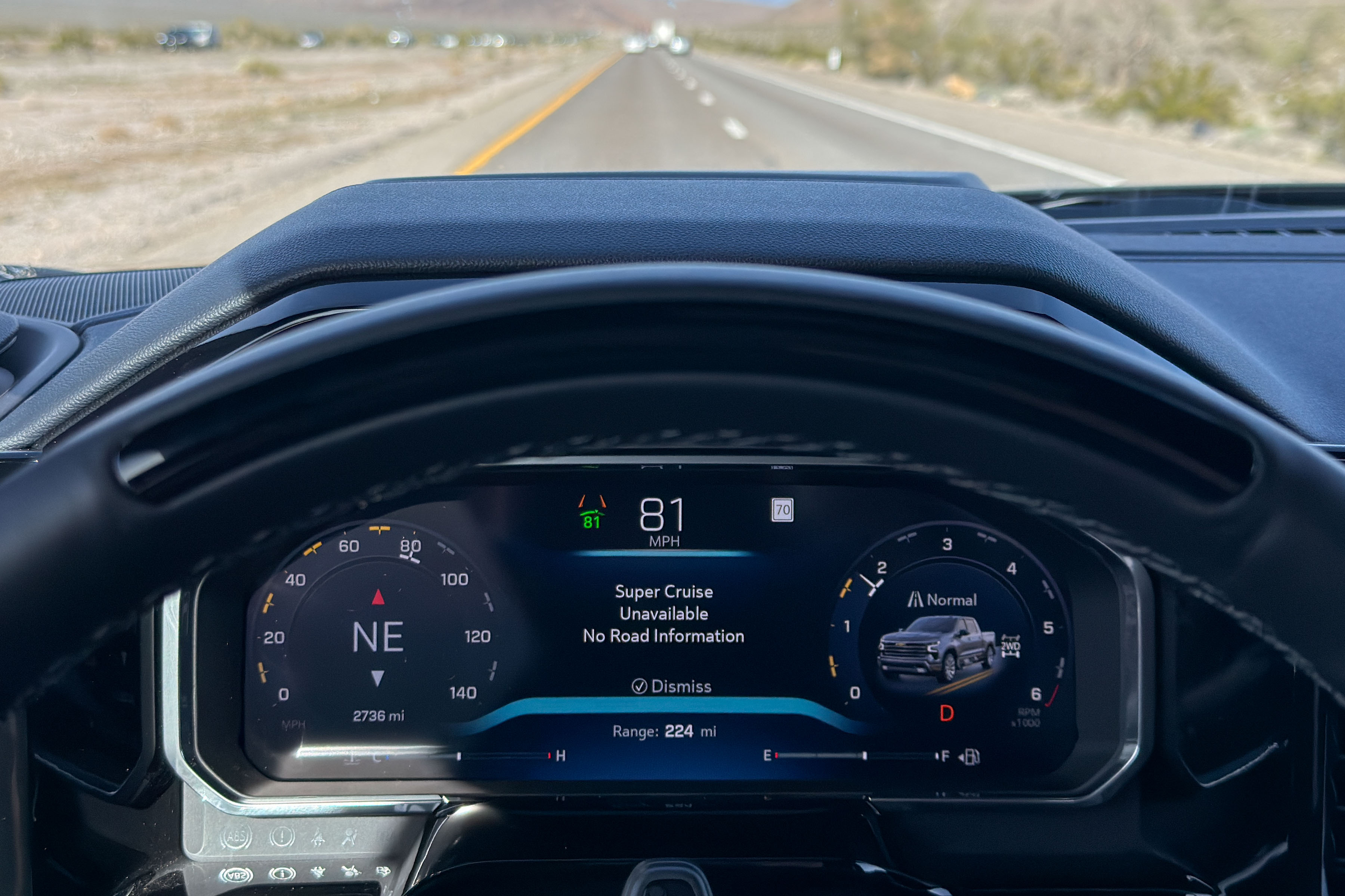 This stint revealed that Super Cruise caps out at 85 miles per hour, though. Normal adaptive cruise will go as fast as the Silverado can. I may or may not have seen 112 mph, as a test.