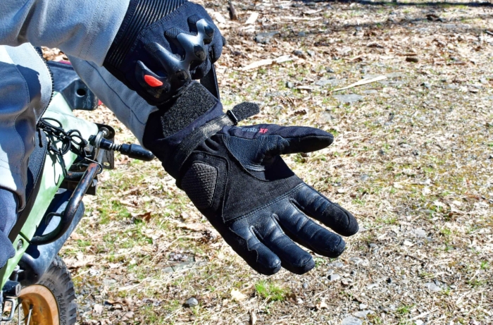 We loved the oversized pull strap that helped us slide into the Sand 4. REV’IT! included goatskin leather across most of the palm and the underside of the fingers. The index finger has touchscreen capability.