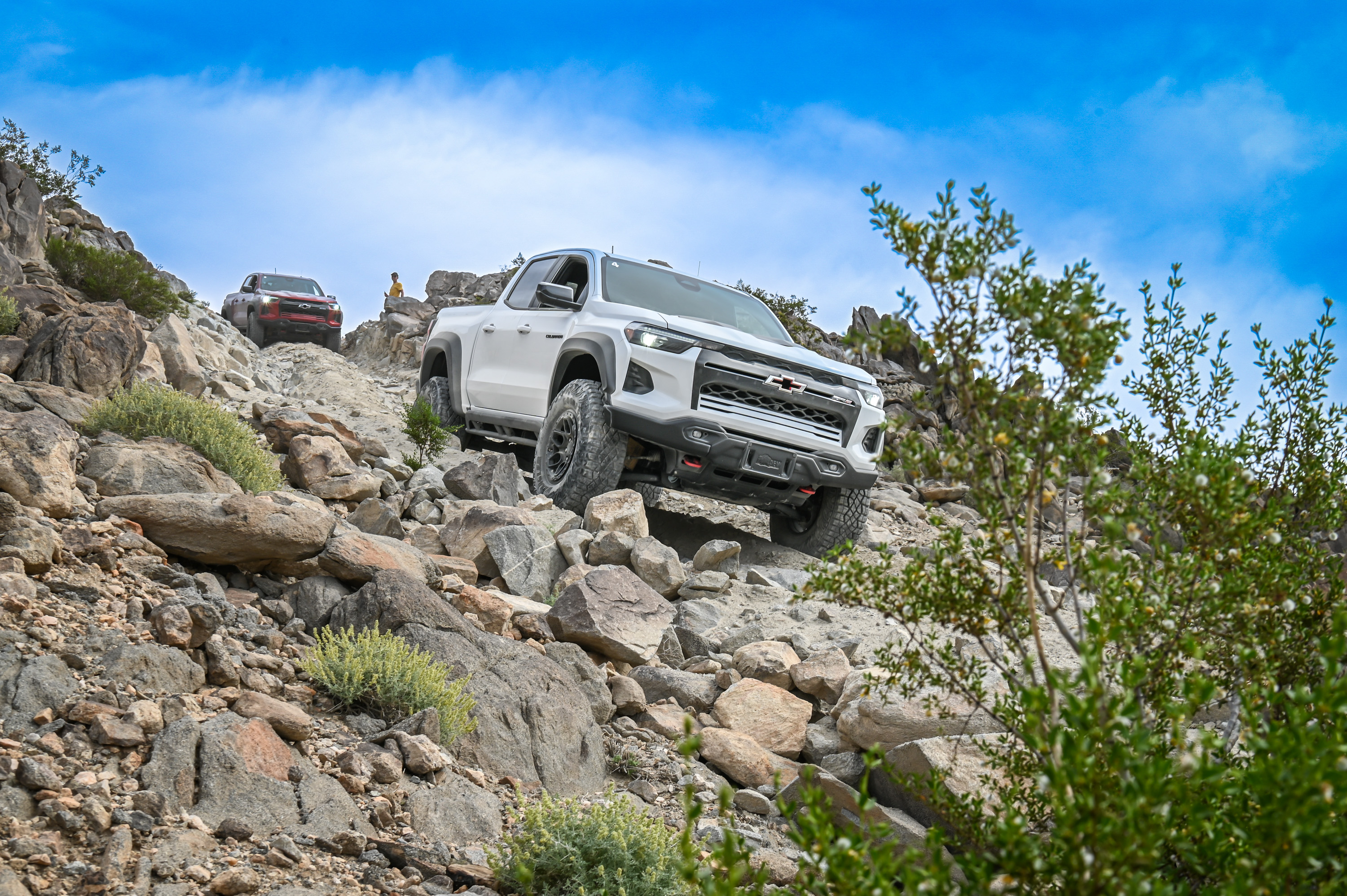 The Chevy Colorado ZR2 and Canyon AT4X are impressively capable of off-road adventuring. The midsized pickups both get Multimatic DSSV dampers that can handle extreme off-road conditions with a shocking degree of comfort, plus a 2-inch lift, 33-inch all-terrain tires, and protective skid plates. There are locking diffs at both ends, too.