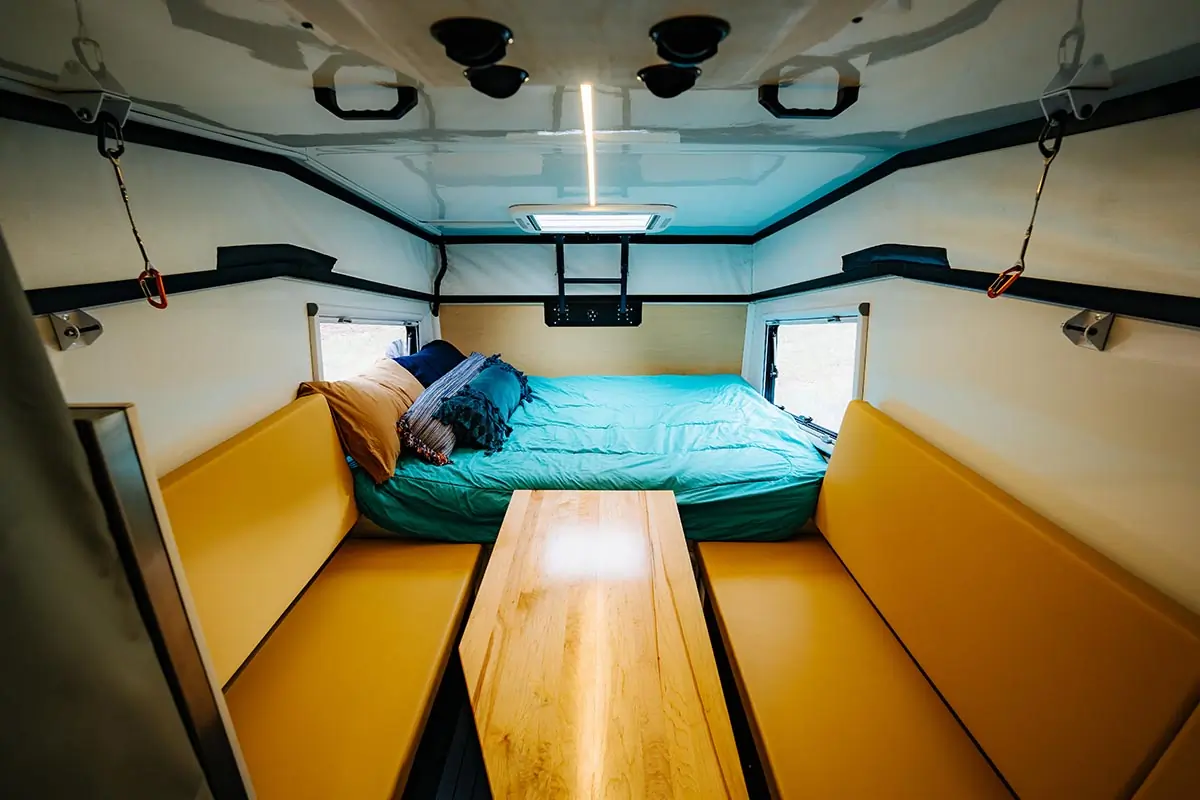 Boreas Campers claims at least four people could sleep inside on the permanent queen bed and soft bench seats of the dinette. There’s also a fold-down bunk option that could accommodate a child. Road trips in the EOS-12 are workable for a family of five.