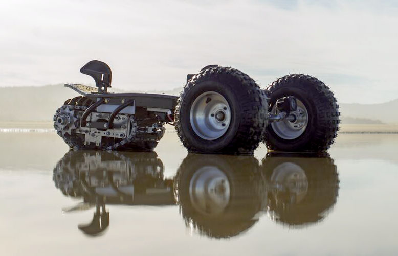 Snow, dirt, sand, pavement—the Track 1 conquers them all. Two burly front wheels and one rear track—think miniature tank tread—propel the Track 1. It tops out at 20 mph with a range of 12 miles. The caveat? This e-board goes for a hefty $2,800.