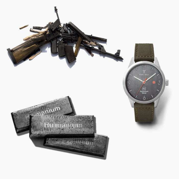 Illegal firearms are the secret behind Triwa x Humanium Metal Watches. The metal used in this watch is crafted from Humanium Metal, or metal gathered from destructed illegal firearms. The nonprofit IM Swedish Development Partner retrieves and melts down the guns from conflict-torn societies, turning them into functional metal. Then, the nonprofit refines it into molds for watches. Triwa x Humanium is on Kickstarter now for $225.