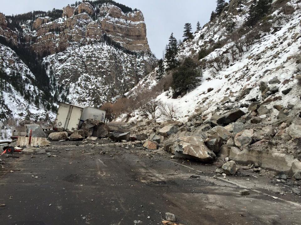 The smart-car sized boulders slammed into two semi-trucks that were traveling on the highway at the time. Neither of the drivers of the semis was injured. A passenger car was also hit by rockfall, with no injuries reported.