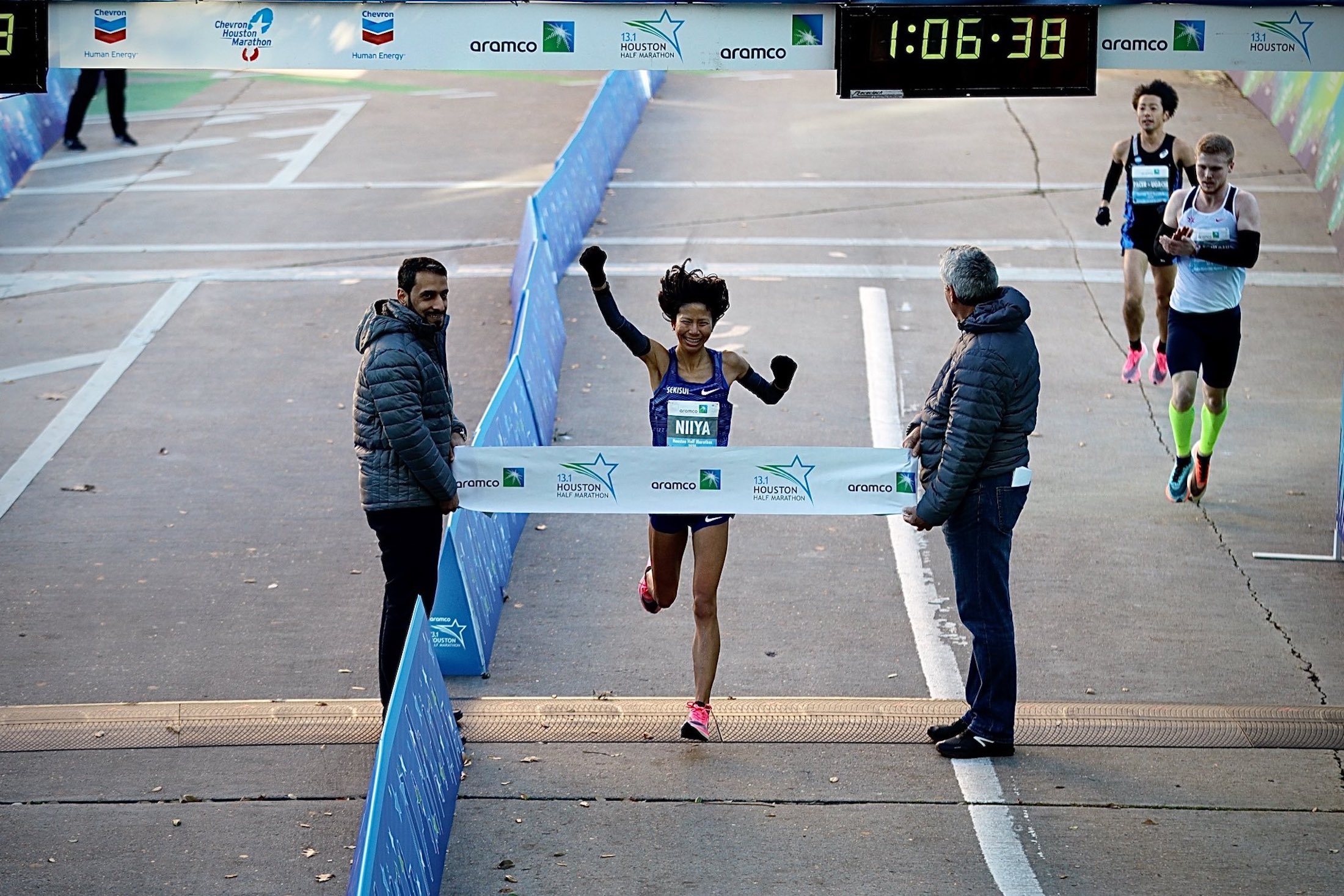 HALF: Runners Break National Records at Houston Marathons. Hitomi Niiya of Japan won the women’s half-marathon race in a time of 1:06:38, setting a new Japanese national record and finishing a whopping 90 seconds ahead of her closest competitor.