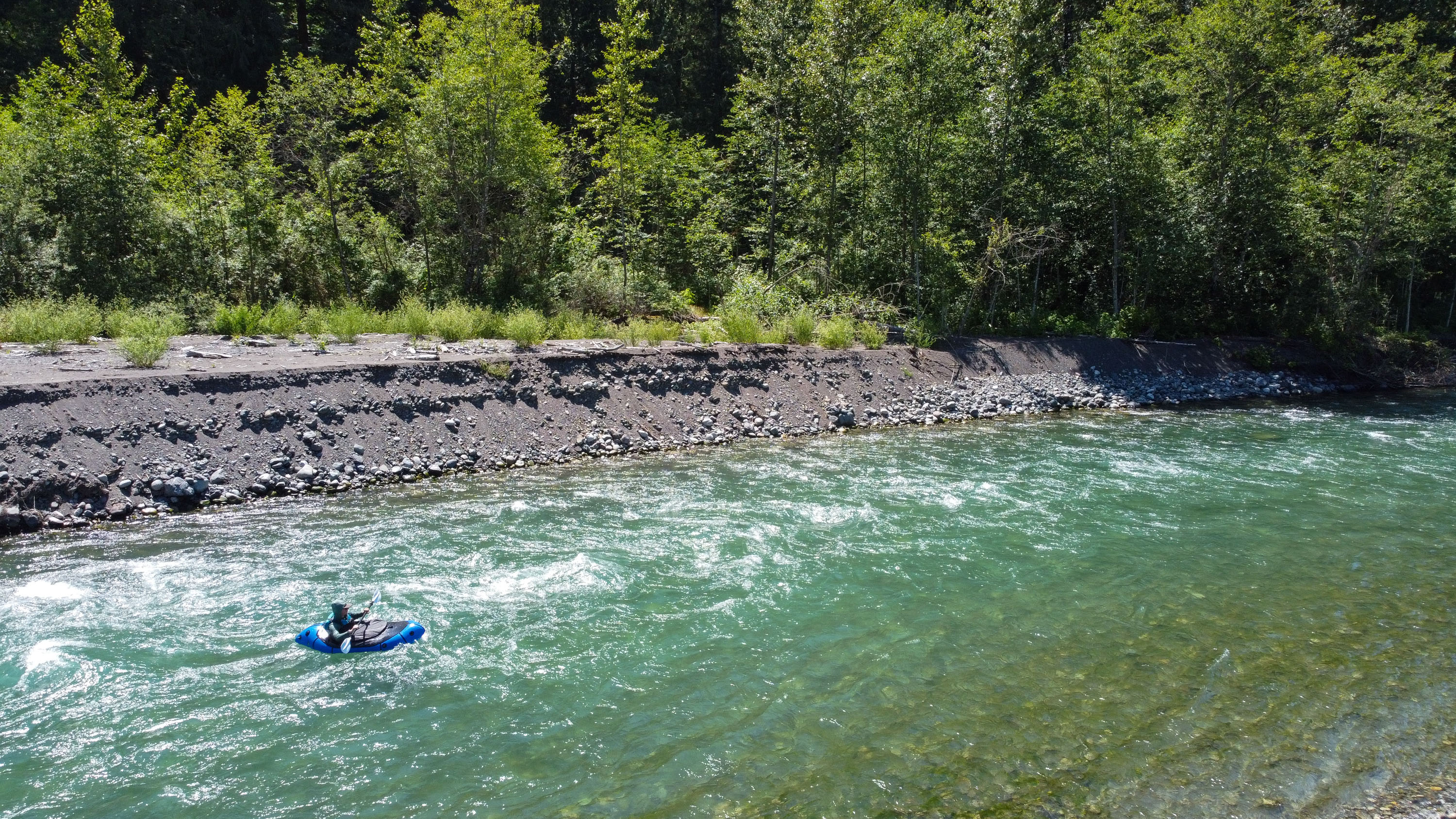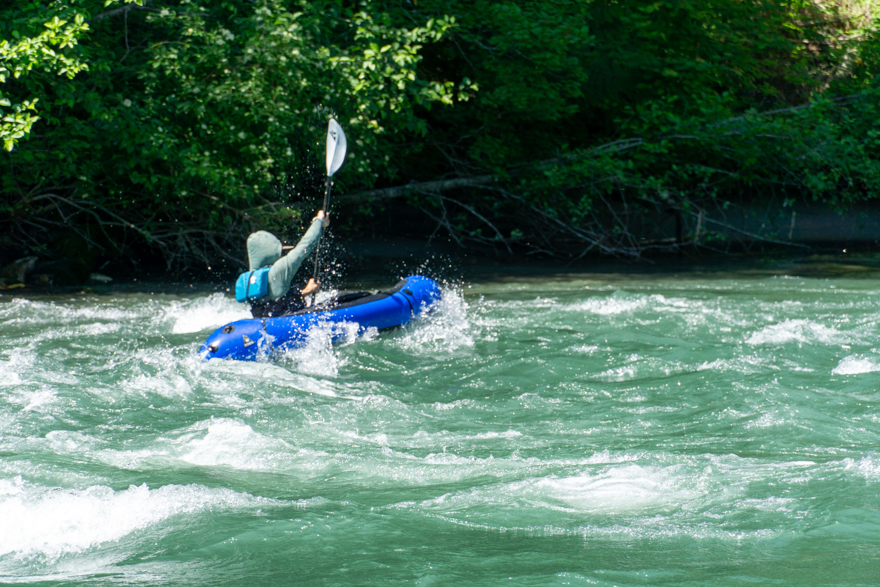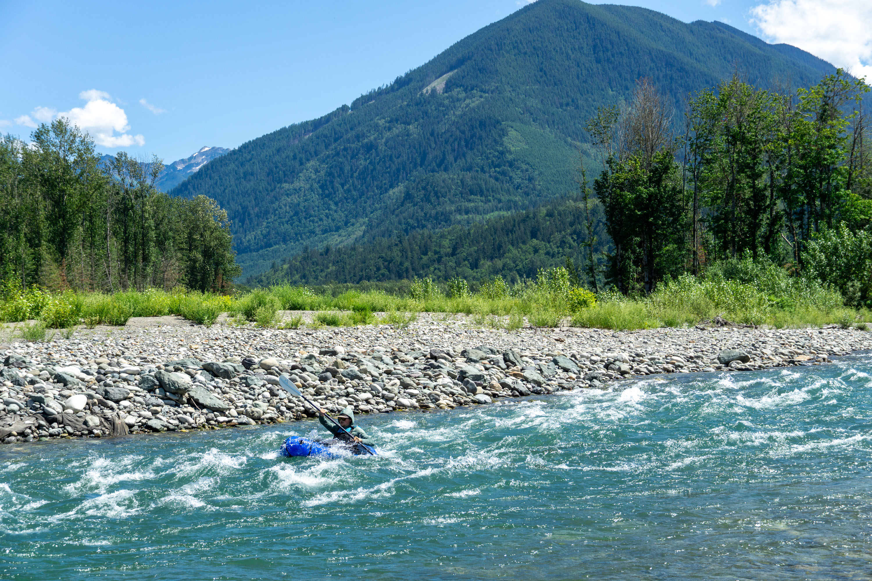 To better gauge the packraft’s capabilities, I recently took it for a 25-mile rip on the Sauk, a National Wild and Scenic River that drains the depths of the Glacier Peak Wilderness in Washington state. The water boils in a glacial blue-green and cuts out of the mountains, muscling across gravel bars on its way to a confluence with the mighty Skagit. In terms of testing grounds, you’d be hard-pressed to manage a better hydraulic playground, and as we slipped from the launch (after a brief re-rig), we got straight to the task.