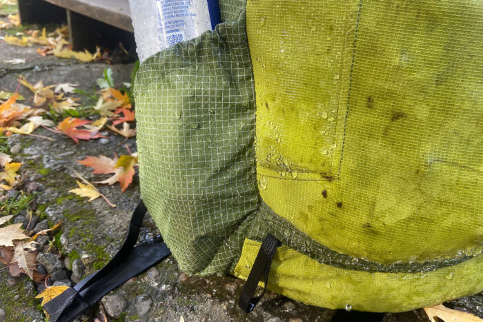 The fabric repelled water well, but, as expected, the mesh pockets fully soaked through. The cinch top let in a small amount of water when the pack was sitting and allowed some water to pool. Overall, I wouldn’t be worried about the occasional rainstorm. But, if frequent wet weather was in the forecast, I would pack a poncho (pack cover).