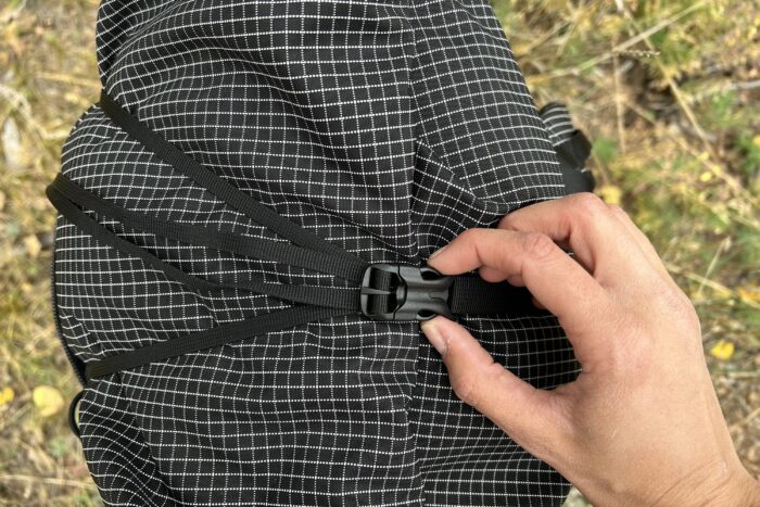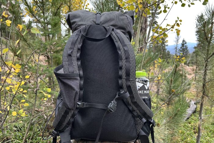 This rolltop style of the pack was definitely a smart move for the pack’s intended use (ultralight/thru-hiking), and the Y-strap is a stellar and crucial part of the design. Moving down the pack, the grab handle, webbing loops, and webbing compression straps all worked well and held up to my testing on trail. Here, the compression straps stood out to me in testing — especially once I loaded up the side pockets with 1L bottles, and a set of collapsible trekking poles.