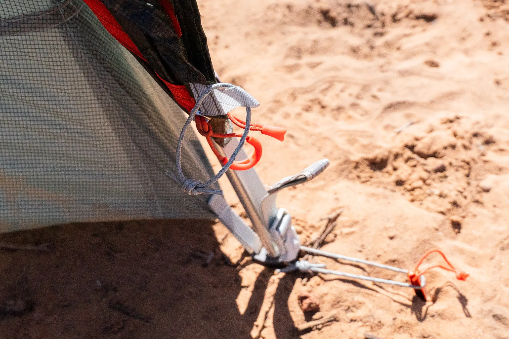 Non-freestanding tents use the tension provided by stakes firmly planted around the trekking or support pole to hold the poles in an upright position. The stakes should consequently be on the longer side and driven into the ground at an angle or reinforced with large stones. Short stakes placed in loose or sandy soil can be easily plucked out by a strong gust of wind, causing your nylon home to fold in around you at three in the morning.