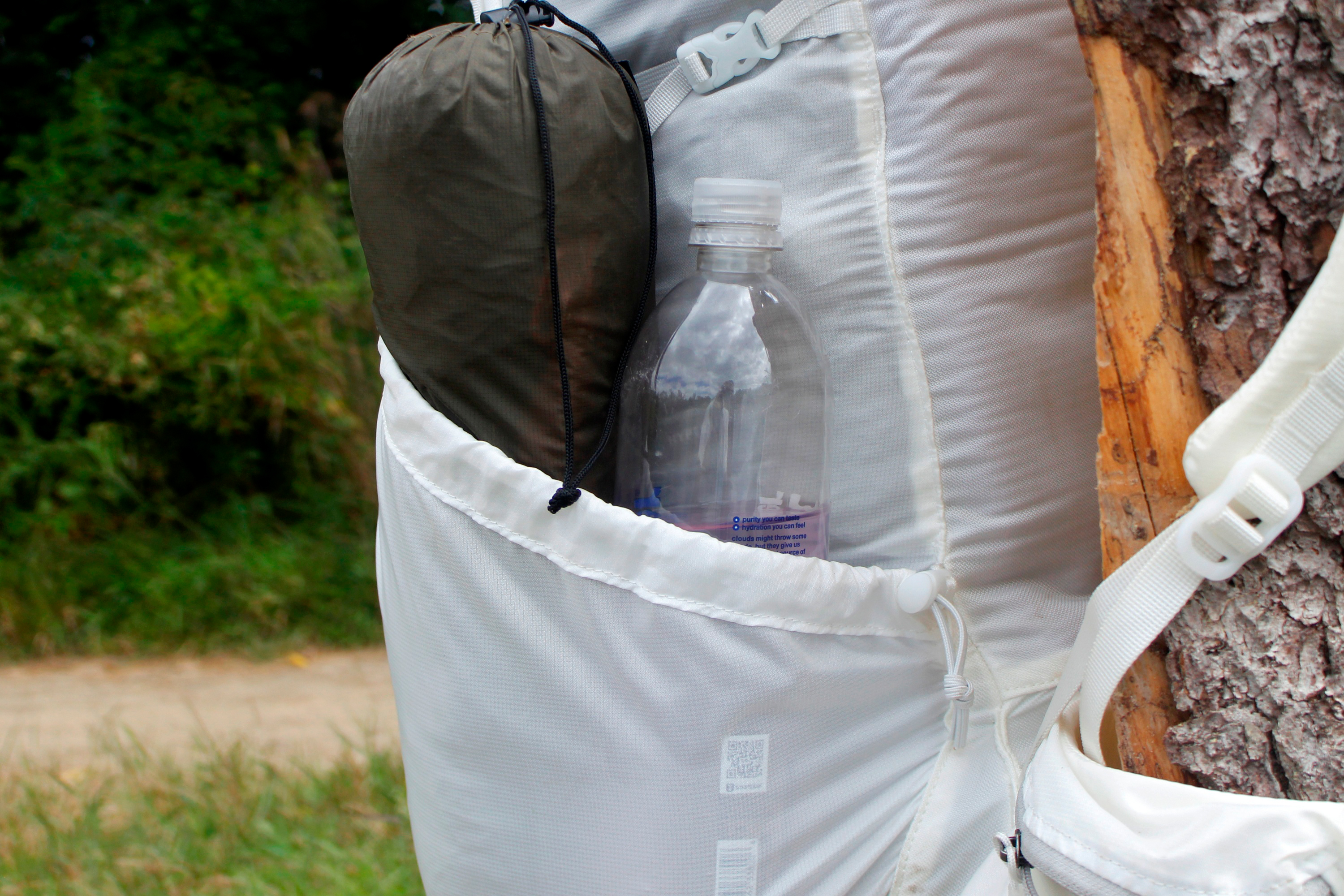 In addition to a shock cord cinch topping each pocket, there are two side compression straps — the bottom-most of which can be routed beneath the pockets to make drawing a bottle easier. Topping off the external storage are two hip belt pockets that, while a tad small for the largest of Otterboxed cellphones, are generously spacious for an ultralight pack.