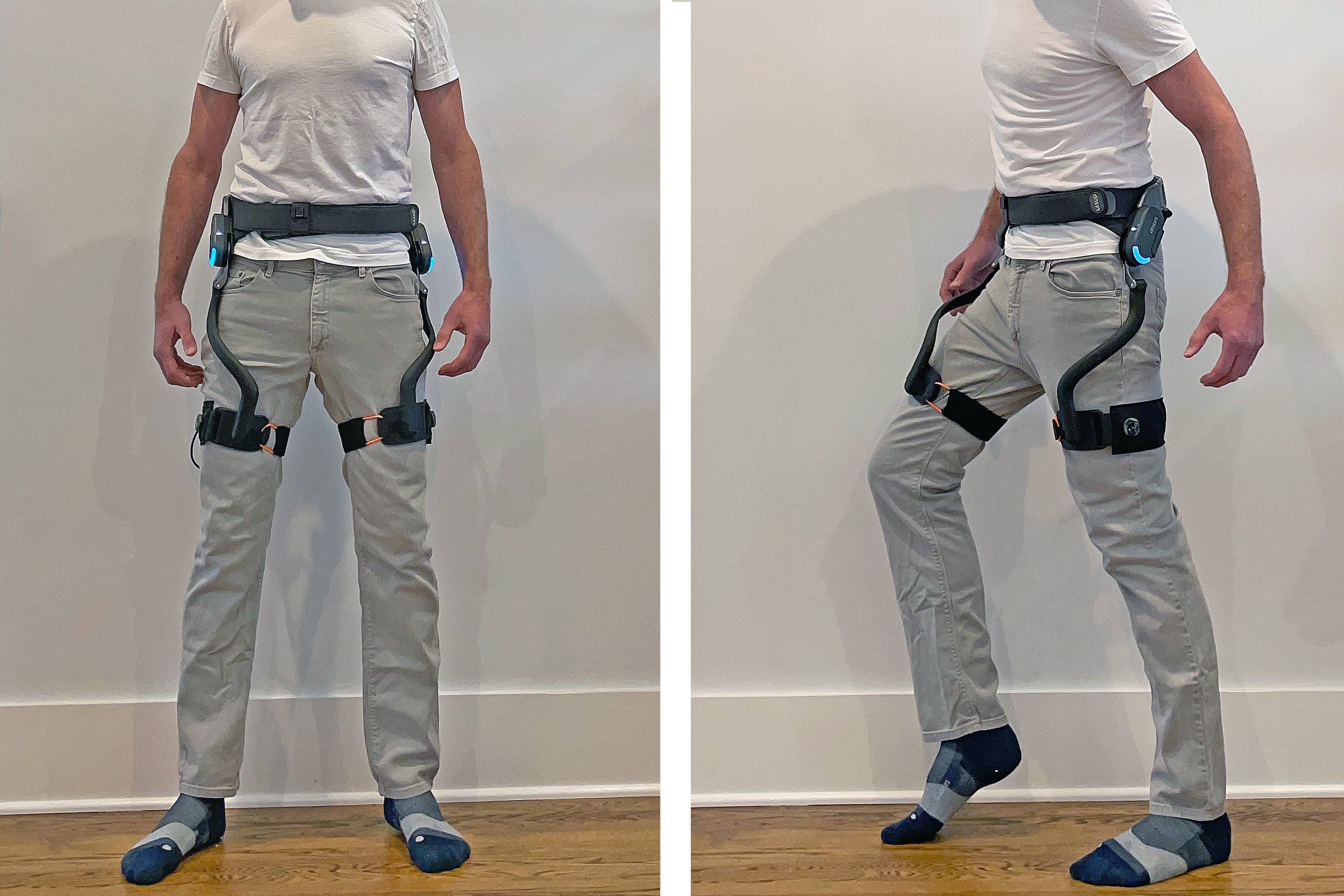 The X1 straps onto your waist using a large band that can be adjusted with a telescopic panel. It secures a pair of carbon fiber leg rods to your thighs with hooks and loops. The semi-elastic straps are adjustable with a BOA system.