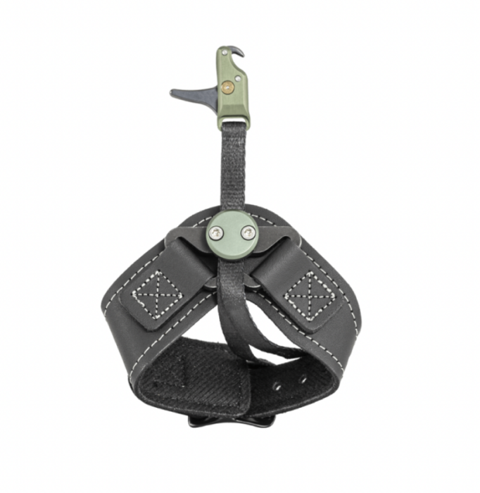 This is a single sear open hook release aid with an angled forward trigger to maximize draw length. B3 Archery offers this release in an adjustable flex(web connection) and a swivel model. And the wrist strap operates via a buckle.