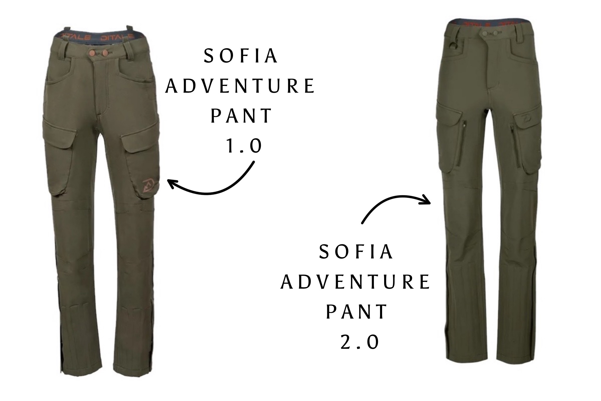 Our Sofia 1.0 was amazing with its features, fit, and function, and the 2.0 builds on our initial success. We pride ourselves on listening to our new and current Ditale customers. They asked for a few things, including back pockets, more adjustment options for our inseams, more stable belt loops to handle a tactical belt, and more sturdy knife area on both front pockets. We also removed the suspender loops because our adjustable and stretch waistband fit so many women that the women who ordinarily needed suspenders did not need them on the Sofia pants. We have made these upgrades for Sofia 2.0 with all the same loved features, fit and function as our wildly popular Sofia 1.0.