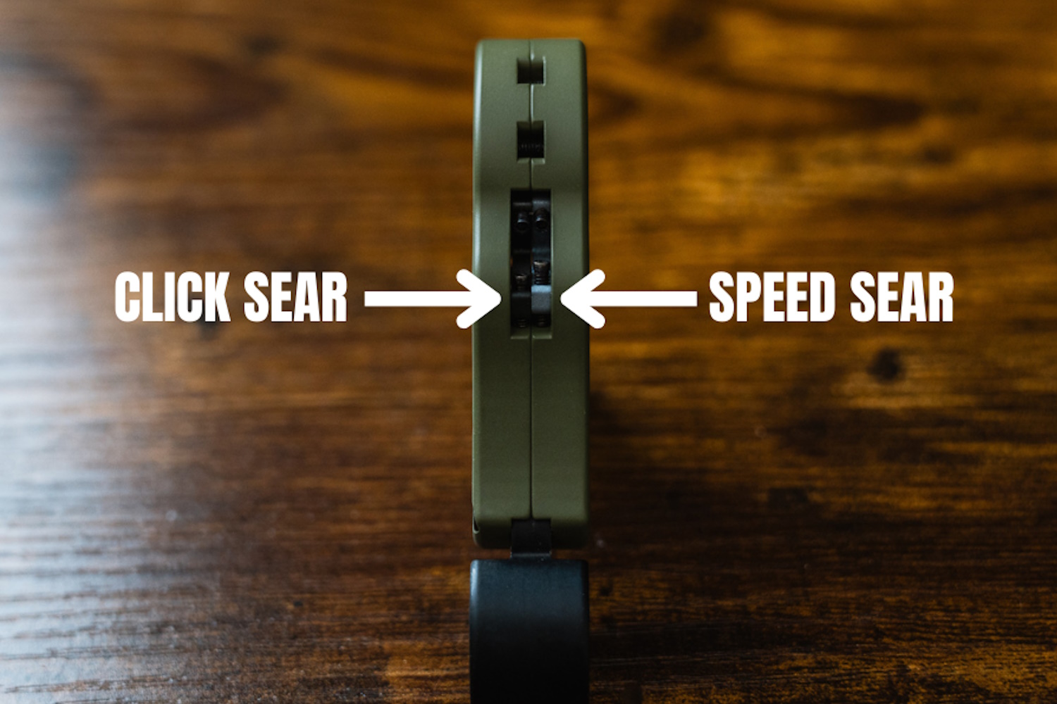 As far as adjustability goes, the third finger position is removable and has three pre-set points to manipulate the angle. You also have a speed sear that controls how fast or slow the release will fire and a click sear that controls when and where you feel the click. Both are adjusted with screws. Lastly, I want to point out that this is 100% made in the USA.
