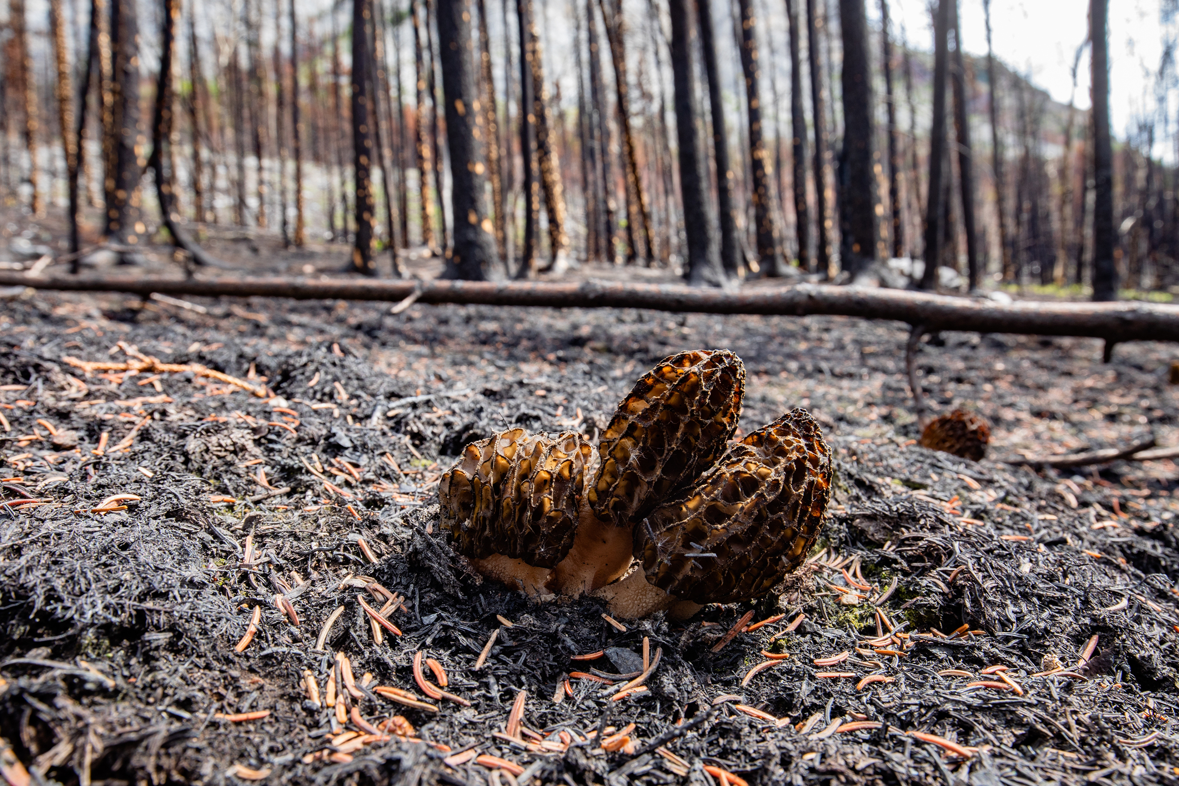 The mycelium of a burn morel attaches itself specifically to conifer trees and sits dormant until a fire comes through. Once the fire has scorched the earth and cooled, burn morels are known to pop up in unbelievable numbers and will for several seasons after the burn.