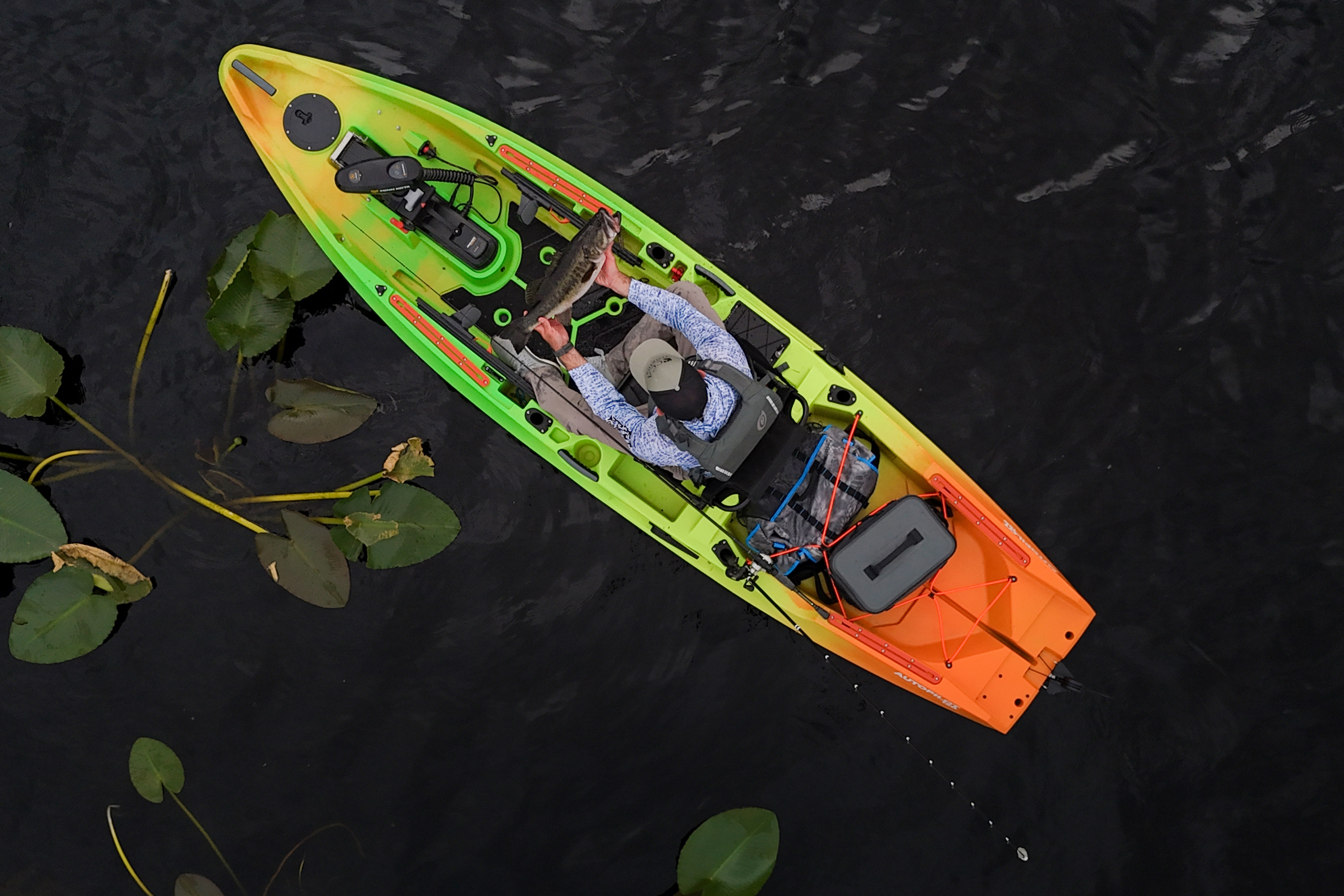 There’s something very fitting about seeing one of the most popular lure color combos on a kayak. Not only is it a rad combo that consistently sees success at the end of the line, but it’s just a rad-looking combo. There’s something very radioactive bass fisherman about the chartreuse and blaze orange combo.