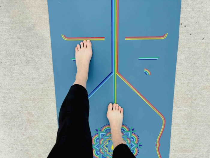 I’ve used many mats over the past decade and a half, and very few have been helpful for positioning. That’s why the Liforme Rainbow Yoga Mat is so unique. It uses what the company calls the AlignForMe system, which includes a vertical line down the center with horizontal lines on both ends. There are several 45-degree lines as well, and all of these are useful not just for standing poses, but also for some poses done on the mat, such as tabletop or cat/cow.