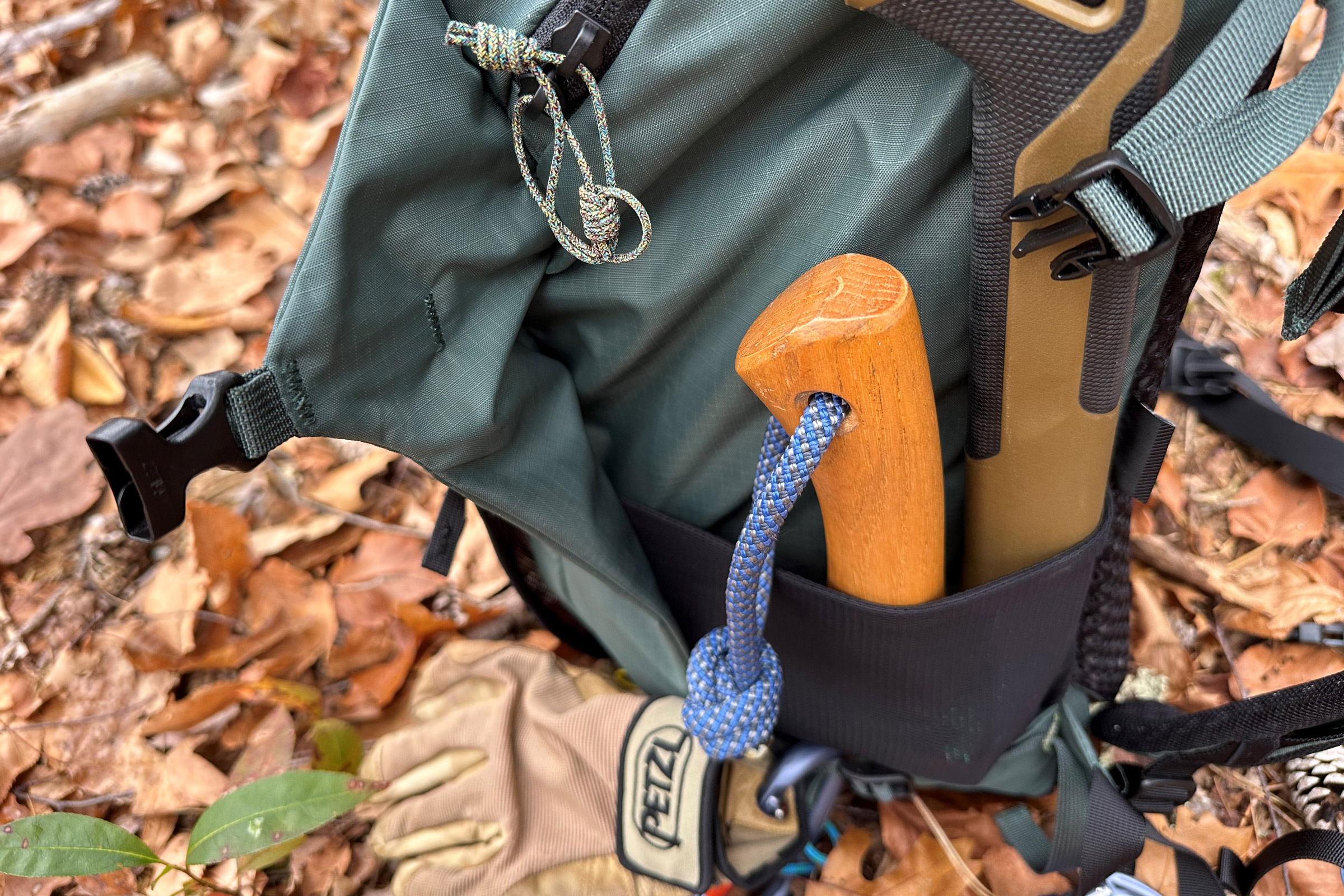 The two yellow loops underneath the removable mesh panel are designed specifically for trekking poles and ice axes. But with just an inch more of “loopage,” you could easily fit an axe or hatchet in them. I’ve got nothing but love for trekking poles and ice axes. I’ve got more love for a solid hatchet or axe.