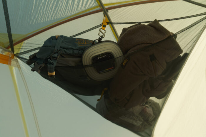 A massive, central, triangular overhead mesh pocket offers at least 15-20 L of storage. This loft alone is genuinely two-person-appropriate, with enough space for pairs of jackets, socks, insulation, etc. At the head end of the tent, there is a long, shallower pocket, ideal for phones, filters, batteries, knives, and other quick-stow items.
