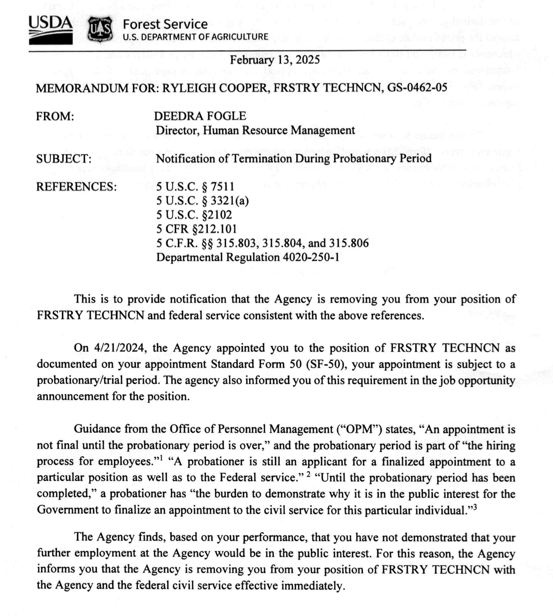 According to a termination letter from the U.S. Forest Service obtained by GearJunkie: “The agency finds, based on your performance, that you have not demonstrated that your further employment at the agency would be in the public interest.”