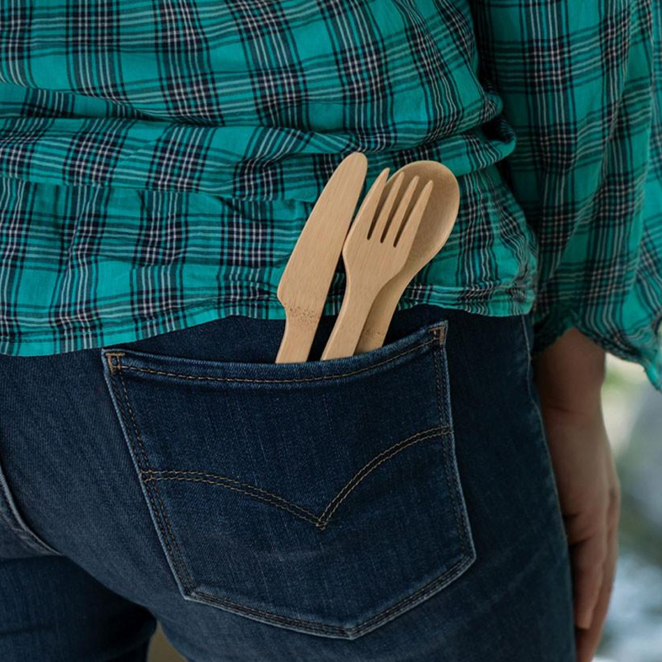 These cutlery sets (fork, spoon, and knife) are made with certified organic bamboo. Each utensil is hand-shaped from a single piece of bamboo. After shaping, sanding and cleaning, a light food-safe oil is applied.