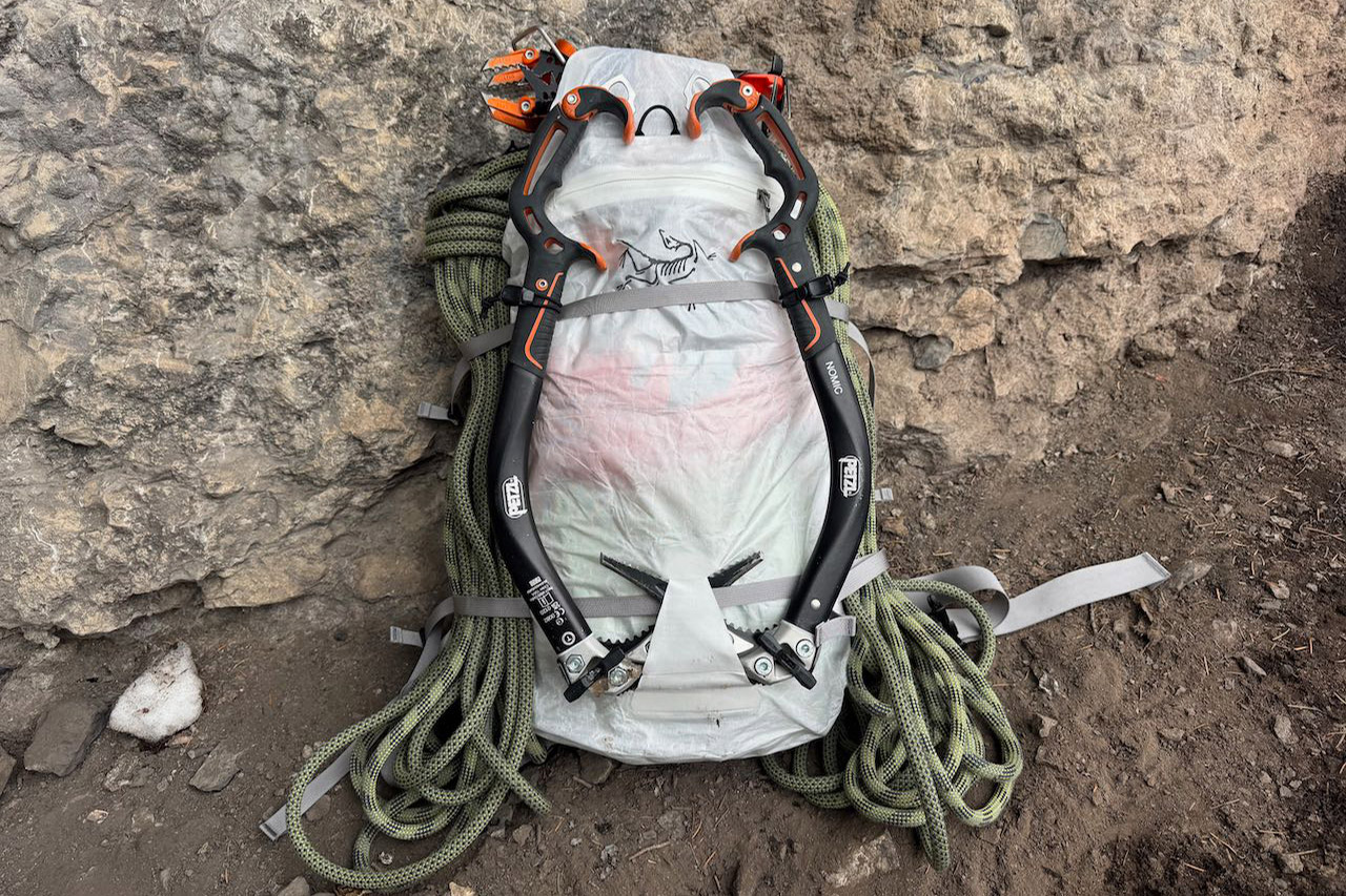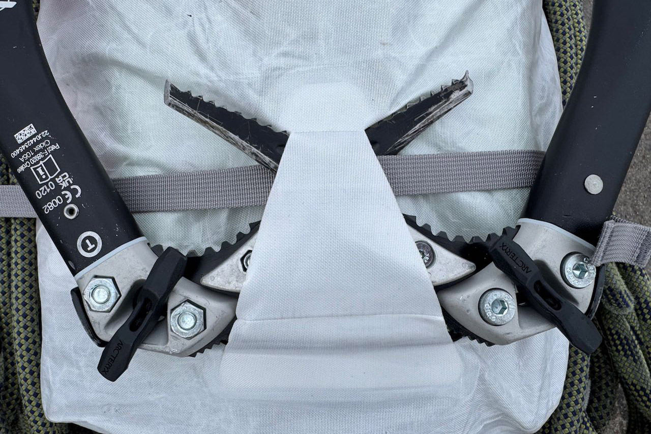 Ice tools attached to the Arc’teryx Alpha SL pack using the integrated carry system