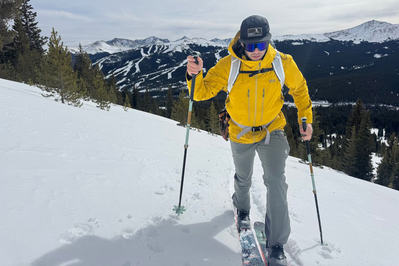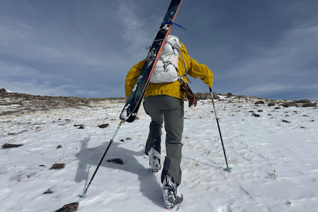 The Arc’teryx Alpha SL pack carried during a backcountry climb with skis attached