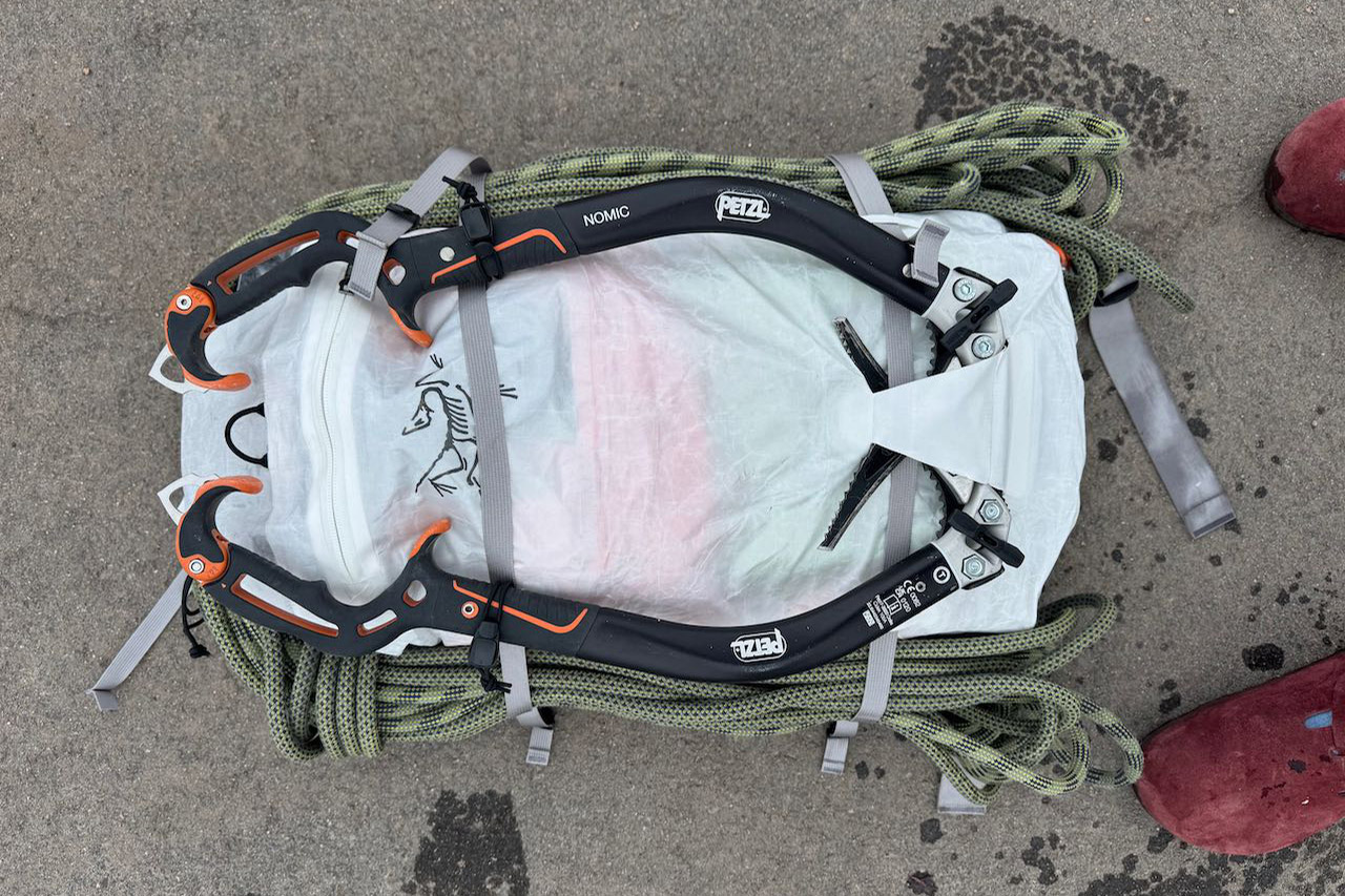 But what would climbing in the mountains be without a little improvisation? It wasn’t overly complicated. I ski-strapped my crampons together and lashed them underneath the upper compression strap. A small carabiner attached to a lash point provides sufficient security. Carrying them, lashed beneath the rope strap, was another option. Perfect? No, but it can be done.