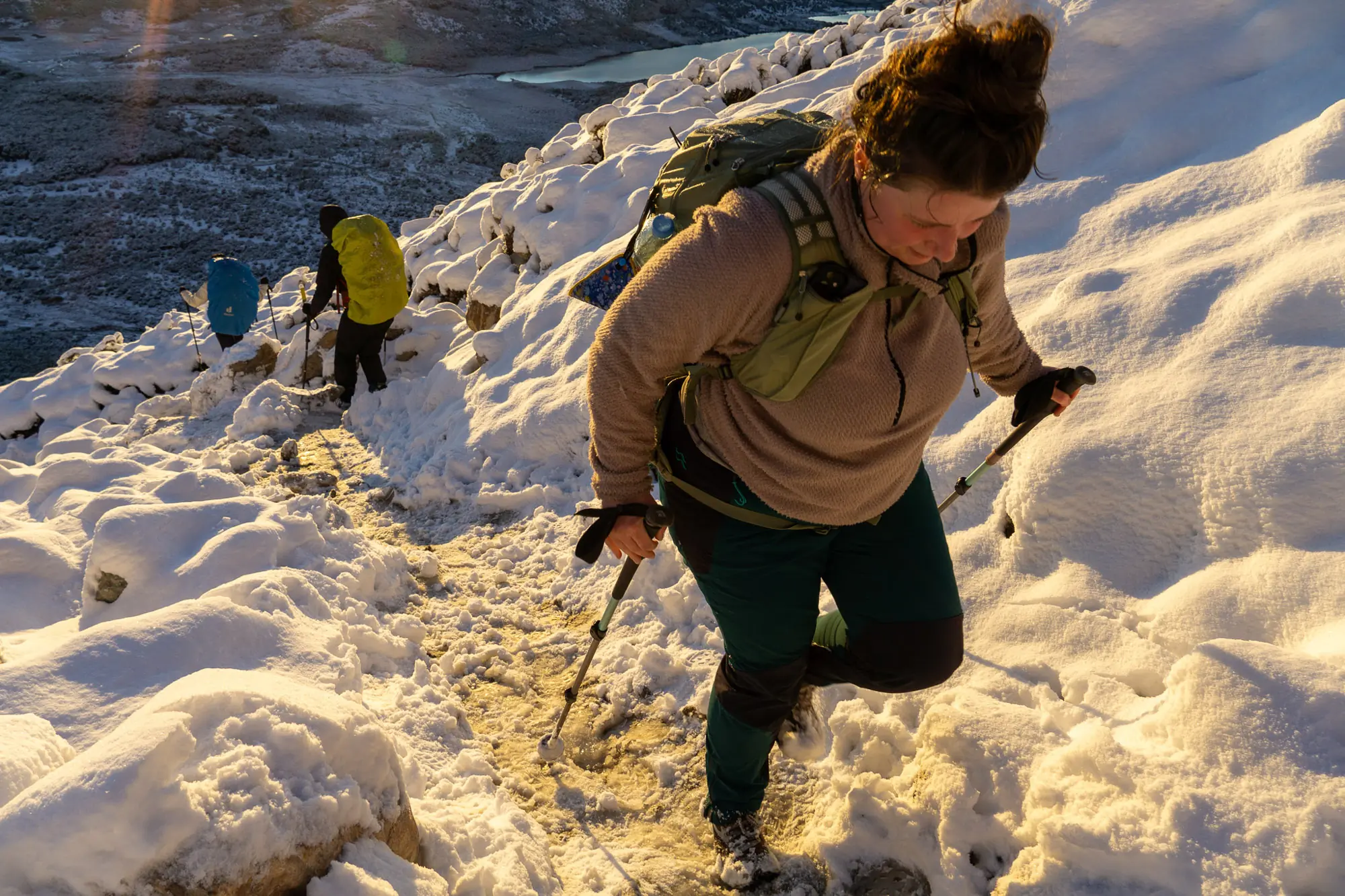 Larger packs can also be a good choice if you’re traveling in alpine terrain and need more space or features— like headlamp pockets, trekking pole sleeves, ice axe loops, a hip belt, and a helmet compartment or exterior stretch pocket.