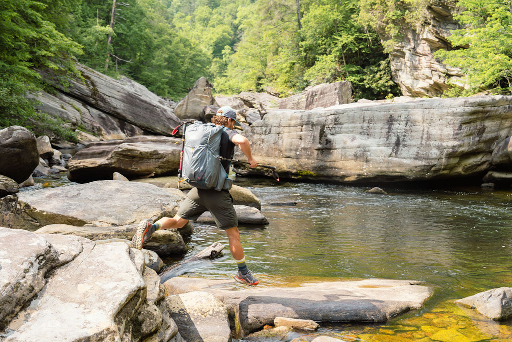 Near the halfway point of the hike, I descended to the Linville River, where I had to make a series of short rock hops to cross the water. As someone who enjoys scrambling across rocks on my adventures, this pack pleased me with its feel and kept weight close to my body.