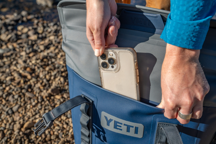 You can buy a Rambler Bottle Sling that attaches to the side of the cooler and can hold your water bottle or bottle of wine. You can also buy the Sidekick Dry Gear Case to store items you don’t want to carry by hand.