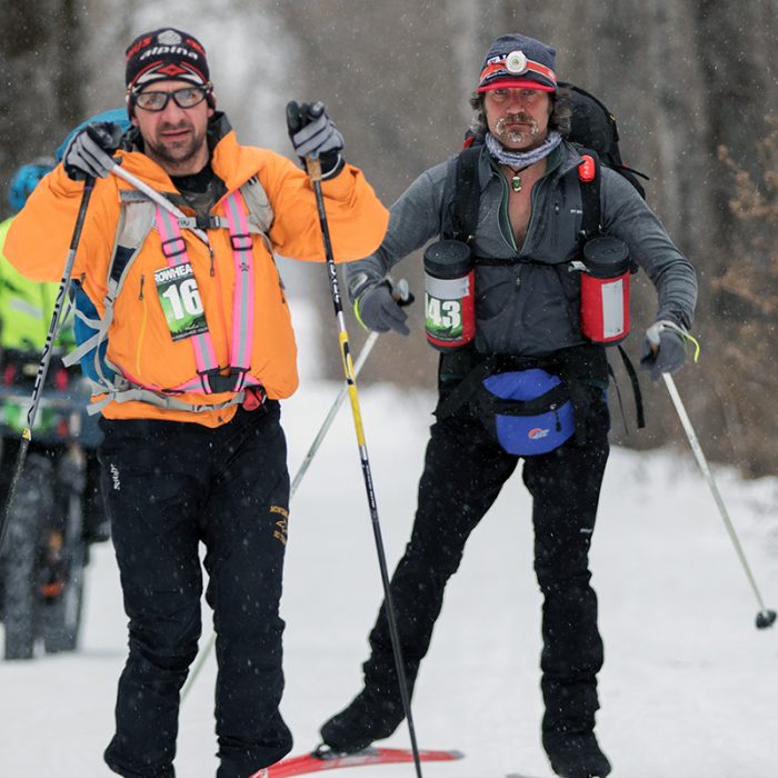 Two of 11 athletes in the ski division at mile 16. Carl Skustad and Dan Campbell. Skustad later finished in 1st place with a time of 32 hours, 32 minutes.